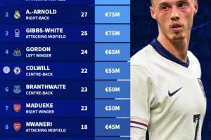体育资讯11月17日讯 德转盘点了缺席本期英格兰名单球员身价榜,具体如下: