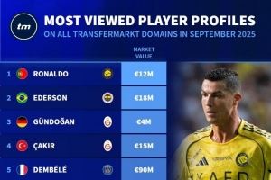 体育资讯10月5日讯 德国转会市场列出了9月份球员页面浏览量排名,C罗居首,埃德森、京多安二三位,梅西排名第7位。