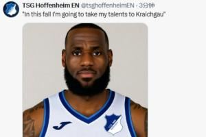而德甲霍芬海姆也借机在社媒玩了一把梗。他们的英文社媒账号晒出詹姆斯身穿霍芬海姆球衣的P图照片,并配文道:“这个秋天,我将把天赋带到克莱希高(霍芬海姆所在地)。”